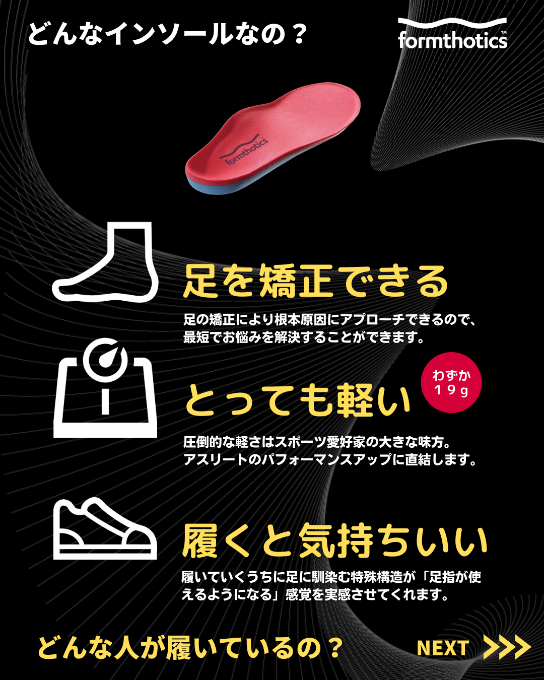 アピールポイントは、【数あるインソールの中でも、世界で最も多くの研究論文が発表されていて医学的根拠に基づく効果が実証されている】、【一般的なインソールは90g位の中で業界最軽量の19g】、【世界中の足専門医が臨床で処方している】、【足、膝、腰の悩みを根本解決出来る】、【他のインソールと違い履きながら足を矯正する】、という点がアピールポイントの一部になります。フォームソティックス•メディカルてなに??どういいの?などよく頂く質問は画像にまとめてありますのでチェックの程よろしくお願いいたします!